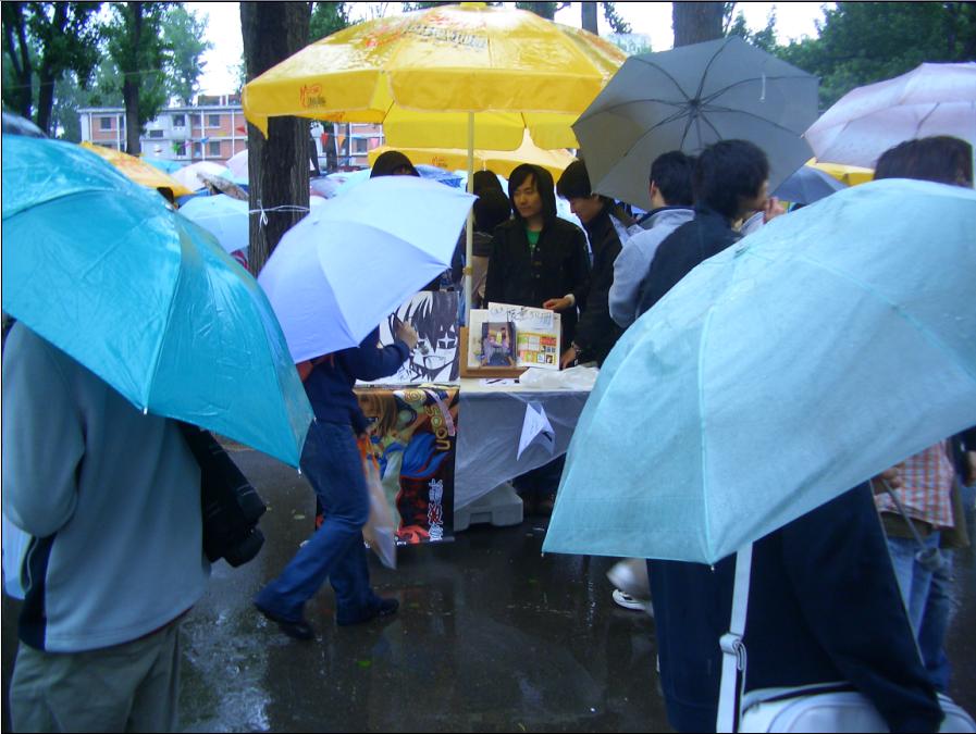 当日は朝から雨だった。僕と友達の日本語ができる中国人『朱さん』のほか、日本のアニメとかが大好きだけど日本語はできない中国人が三人の計五人。ちなみに朱さんはアニメにはてんで興味がないので今日は日中のオタクを交流させる通訳として参加。初対面の人が三人も来るとは思っていなかったし、オタクと言っても話が合うのだろうかと考え込みながらとりあえず会場を物色。