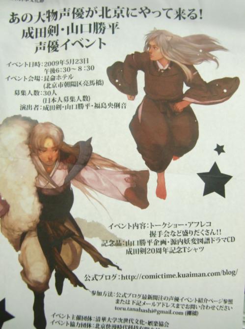 そうです。なんと北京にあの乱馬2/1の乱馬やジャイアントロボの草間大作でお馴染みの山口勝平さんがやって来るというのです。更にコードギアスのオレンジことジェレミアで怪演を振るった成田剣さん(素直に犬夜叉と殺生丸のデュエットって言えよな)と、元声優で今は芸能事務所ウォーターオリオン社長の福島央俐音さんも来ます。