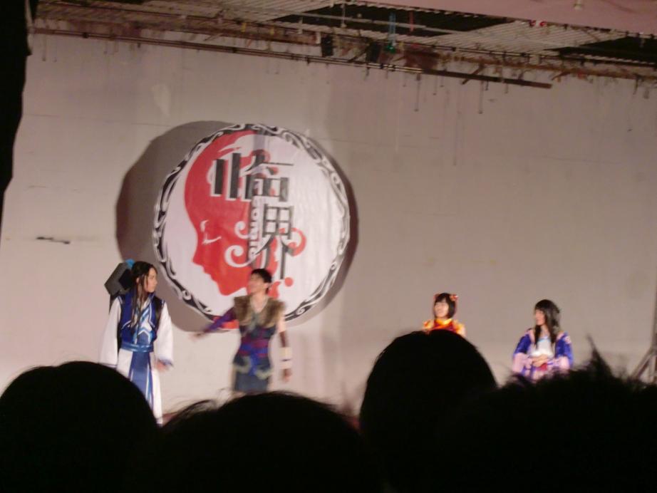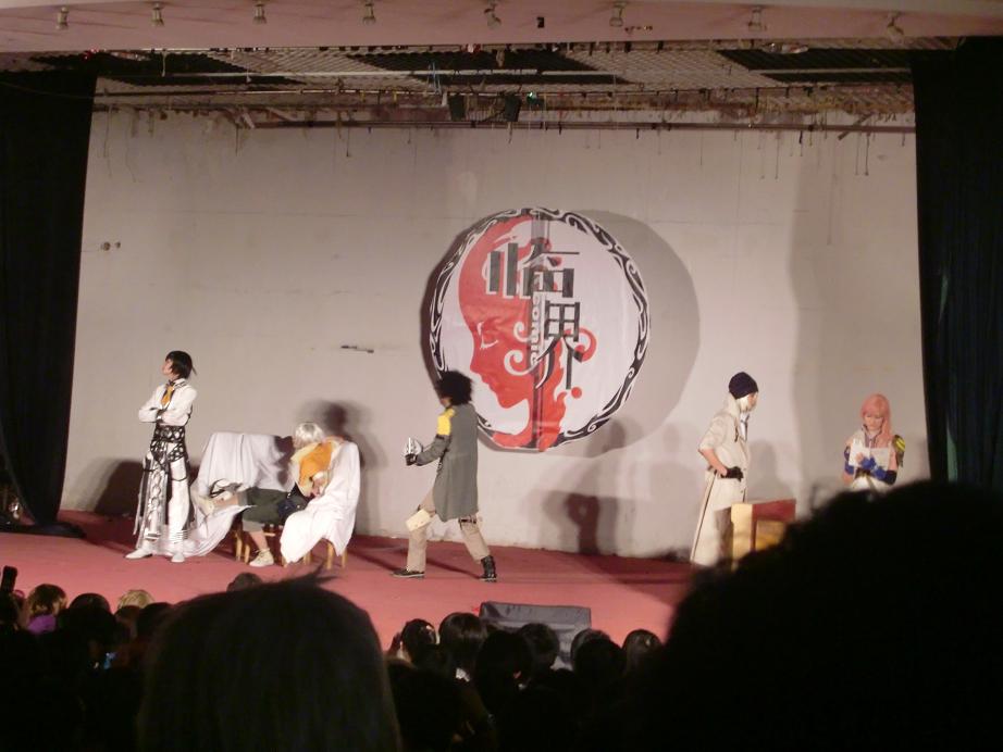 会場の中でおこなわれているのは寸劇である。コスプレイヤーたちがそれぞれキャラに成りきって自分たちで考えたオリジナルのストーリーを演じる。常に動き回っているので台詞は別の人間がマイクで喋っており、舞台上の彼らは基本口パクだ。