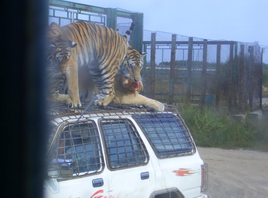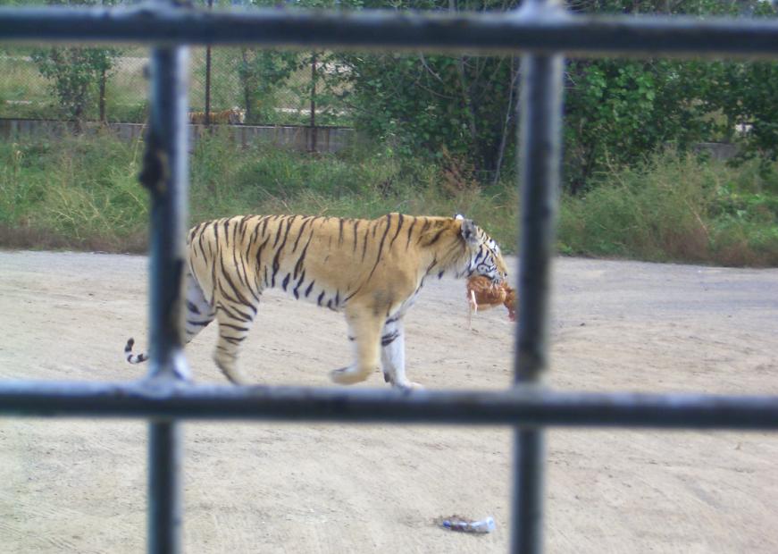 すると別の車が来て、さっき買ったニワトリを放します。辺りには何頭もの虎がエサを待ち構えていました。それを一咬みでしとめた虎は大ざっぱに羽をむしり取ってからニワトリの腹にかぶりつきました。