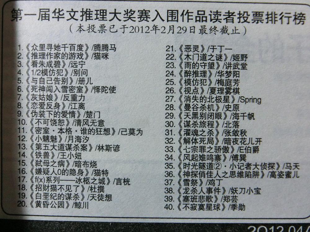 4月号は最終選考に残った作品を告知するだけで大賞受賞作品の発表は5月号以降に持ち越しになりました。この報は4月号の目立たない掲載位置にあったため、大賞作品の発表は是非とも大々的に誌面を飾ってもらいたいです。また中国本土のミステリのレベルを向上させるために、5人の審査員がそれぞれどの作品を推したのかその理由と批評も共に載せて欲しいですね。