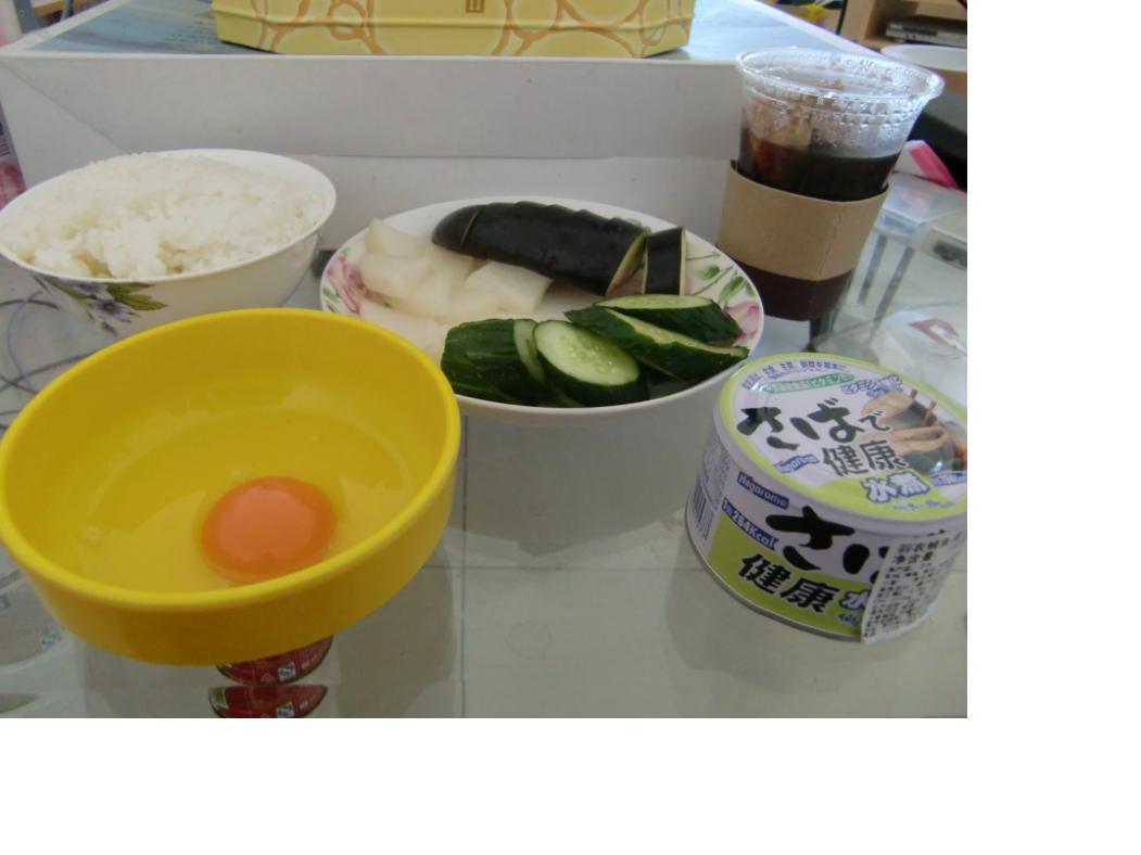 今日の昼は昨日漬けたキュウリと大根と茄子の漬け物に、鯖の缶詰、汁物にコンビニのおでん、そして生卵という極めて健康的かつ質素な食事。