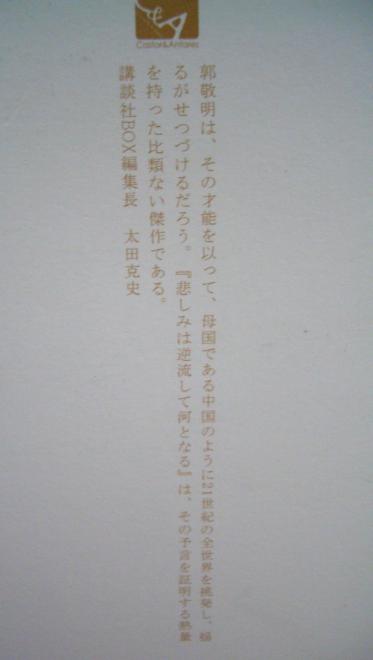 これを読んで気付いたんですが、同じ中国語なのにボクが愛読している推理小説とこの小説は使っている漢字が全然違いました。郭敬明が作品の雰囲気を出すためにあえて難しい単語を使っているのだとも思いますが、比喩や抽象表現は外国人のボクから見てわかりづらいものも少なくなかったです。