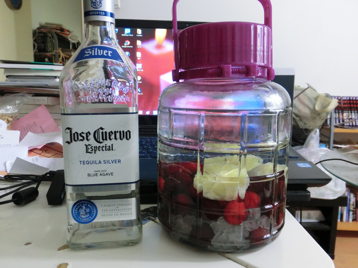 もう一本アメリカンチェリーを使った果実酒を作ったのですが、それには色付きのお酒を使用するため、漬け込みの様子が観察できるようにこれには透明なテキーラを使いました。