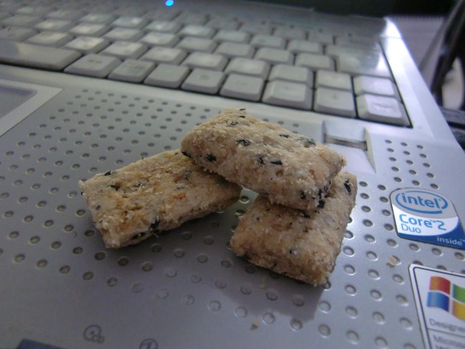 まず黒ゴマビスケット。てっきりパッケージの黒ゴマ豆腐君みたいなヤツが入っていると思ったら本当にただの黒ゴマビスケットだ。