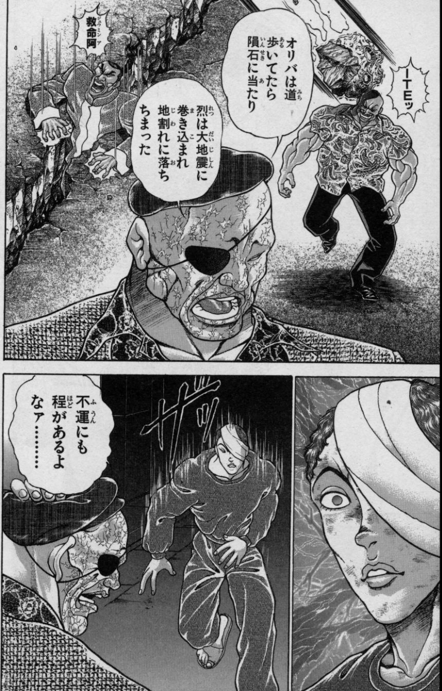 まぁこれは空手家のブラフなんですけど、当時この漫画を読んだ読者はみんな下のコマの死刑囚みたいな『はっ?何言ってんのこの火傷頭』って面を喰らい、『板垣頭おかしくなったのか?』って思いました。なんだよ、このアメリカンジョークはって。アメリカ人のオリバは隕石に当たったのに「ITE」で済ましているし、中国拳法家 烈海王は「救命啊」(助けての意味)って叫んでるし、嘘にも程があるだろうと。