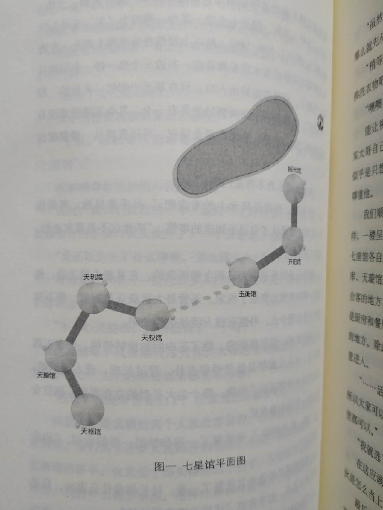 手記が十数年前に書かれたことはともかく、白越隙たちの捜査と七星館での殺人事件は同時並行しているのかという点について、著者はかなり多くのヒントを出している。白越隙たちのパートは、「健康コード」のせいで行動が制限されるとか、どこへ行くにもマスクが必須とか、現在(本書執筆時の2021年末)の中国の新型コロナ事情をこれ見よがしに記している。それに対し、七星館の方は話の舞台を不明瞭にしていて、なんとなく過去の話だと読んでいて感じる。要するに、にぶい読者であっても、二つのパートは並列していないと分かる構成になっている。