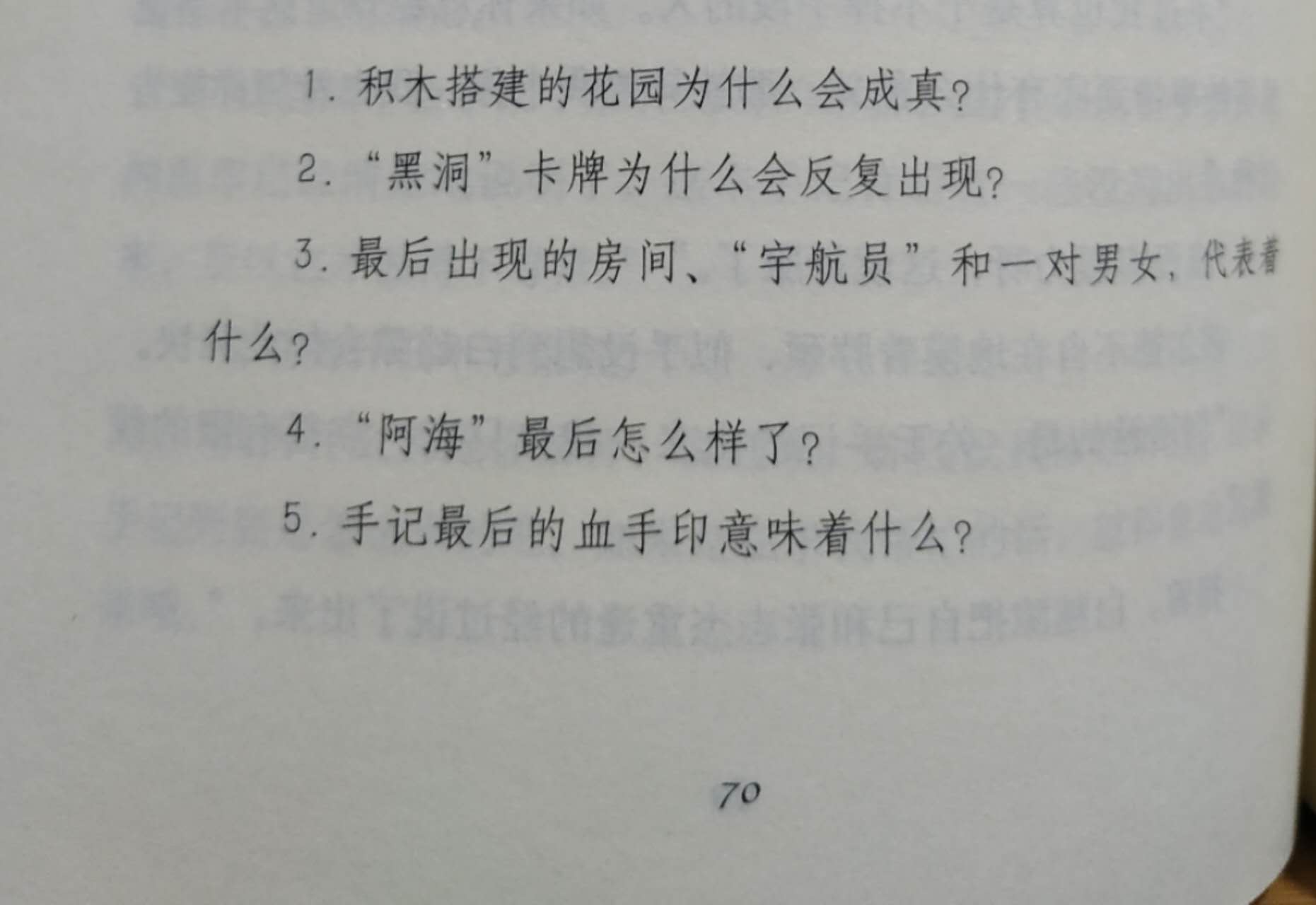手記が十数年前に書かれたことはともかく、白越隙たちの捜査と七星館での殺人事件は同時並行しているのかという点について、著者はかなり多くのヒントを出している。白越隙たちのパートは、「健康コード」のせいで行動が制限されるとか、どこへ行くにもマスクが必須とか、現在(本書執筆時の2021年末)の中国の新型コロナ事情をこれ見よがしに記している。それに対し、七星館の方は話の舞台を不明瞭にしていて、なんとなく過去の話だと読んでいて感じる。要するに、にぶい読者であっても、二つのパートは並列していないと分かる構成になっている。