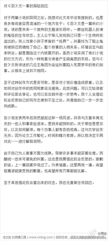 程婧波は読者から何度も聞かれるからという渋々な態度で、それにしてはまとめ画像まで作ってノリノリな感じで問題について言及していますし、夏笳の方は読者からのバッシングや悪口などを極端に恐れているようで、的外れな批判には今後一切応じないと明言しています。