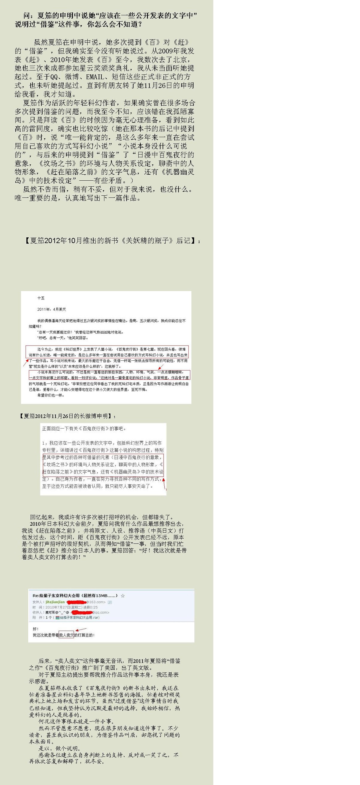 11月26日、夏笳は突然何の脈絡もなく自身の作品『《百鬼夜行街》に関することについて正面から返答する』という長文ツイートを発表します。