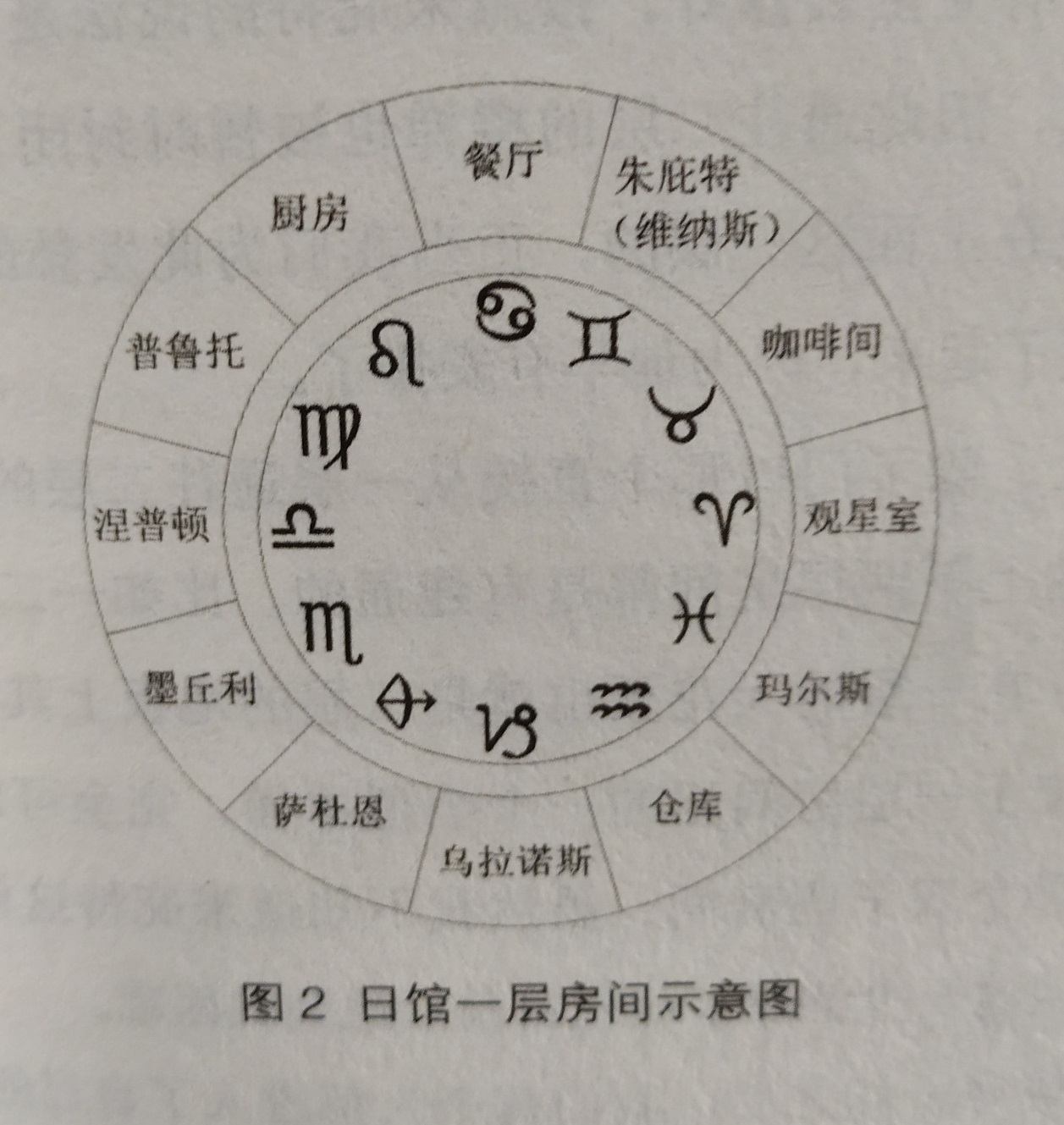 本書では『日月星殺人事件』と『時間の灰燼』の2つのストーリーが交互に展開する。前者は日館の2階で陸宇や陳黙思たちが殺人事件に巻き込まれるパートで、後者は日館の1階で天文愛好家たちがペダンティックな天文学知識を話し合うというパートだ。天文愛好家たちは、ジュピターやマーズなどの惑星の名前を名乗り、本名を伏せられている。2つのパートを交互に読んでいくと各人の名前を予想できるようになっているが、この予想というのが曲者で、作者側から確固とした言及がないのに勝手に姿を想像した時点ですでに作者の罠にハマっている。