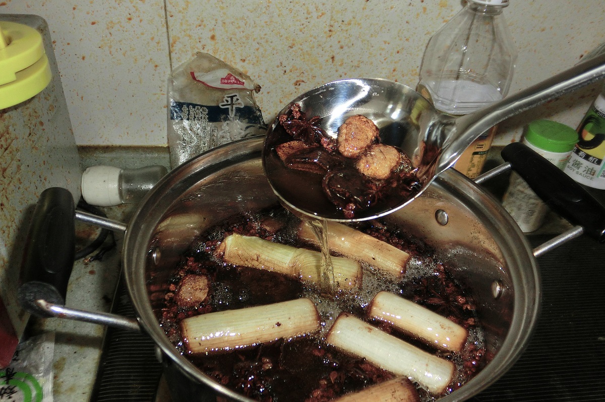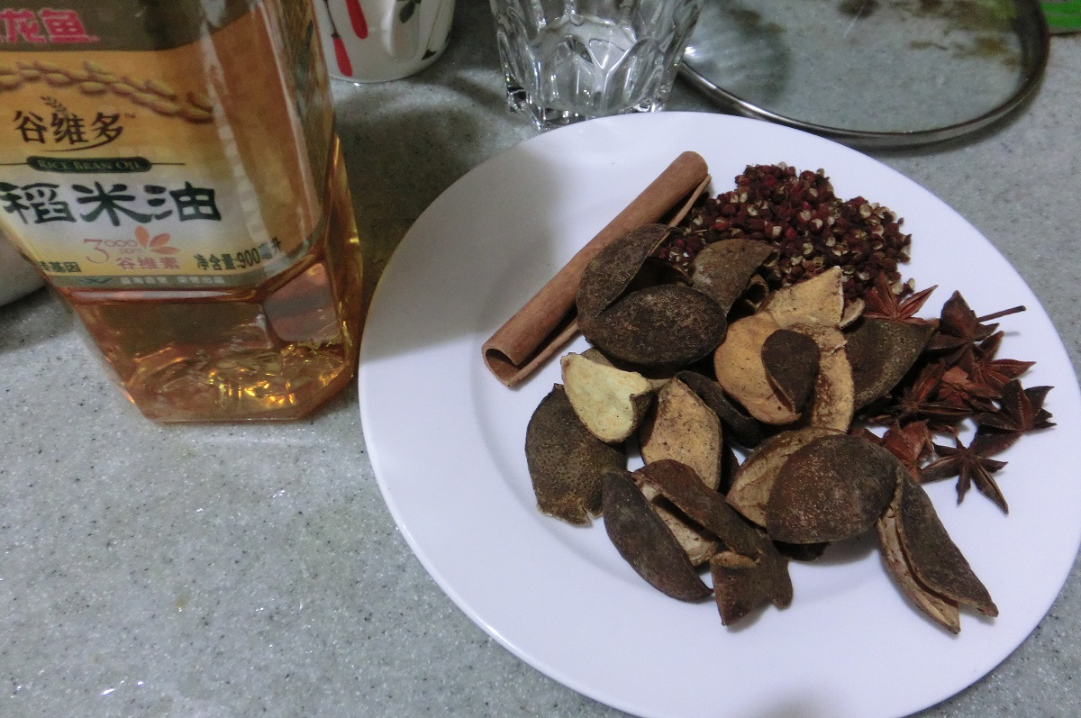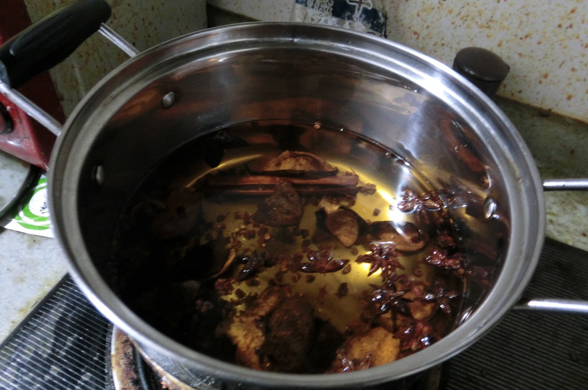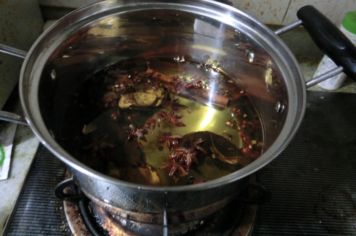 熱せられた油から柑橘系のいい匂いがします。花椒の清冽な香りもしてきましたが、桂皮の匂いが全然感じられなかったのが意外でした。