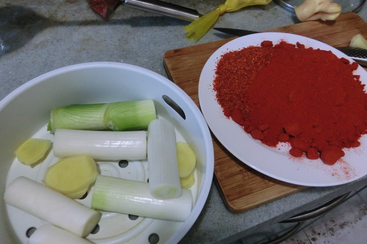写真右のサラサラしている方がキムチ用唐辛子粉です。写真左は葱と生姜です。