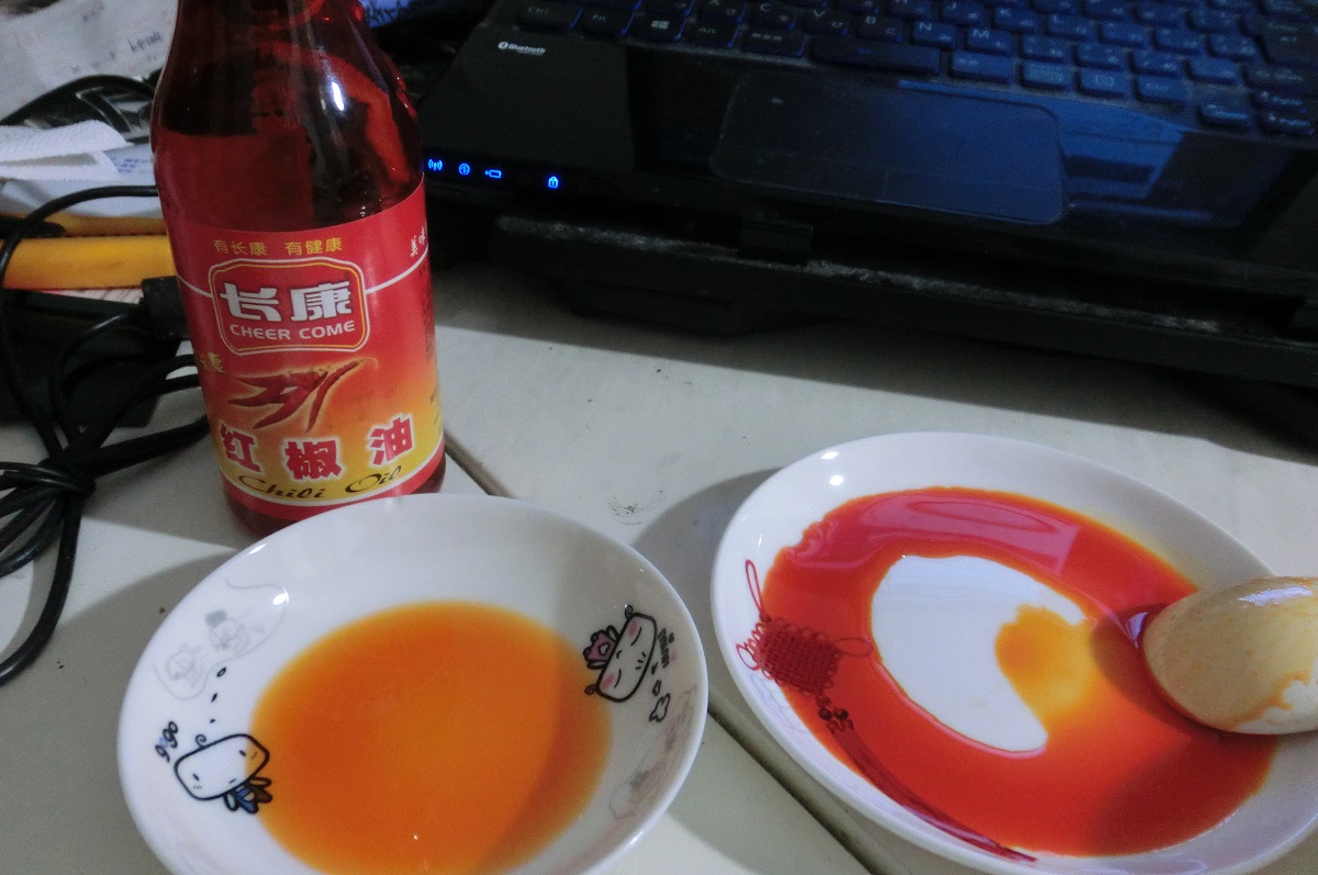 このラー油は原作ではスカーレットと形容されていましたが、確かに市販のラー油よりも色が濃かったです。(写真左が市販品で右が自家製品です)