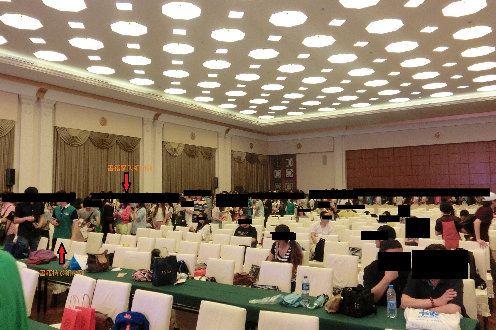ちょっと見づらいかもしれませんが書籍購入組の列は部屋を一周し更に外にまでズラッと並んでいるのに対し、持参組の列はせいぜい数十名しか並んでおりません。