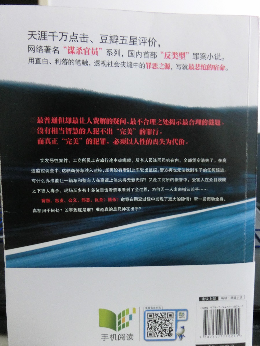 ちなみに本シリーズはもともと『謀殺官員』シリーズ(役人ぶっ殺し)シリーズっていうヤバいタイトルでネットで発表されていたのですが、書籍化する際に流石にこのタイトルじゃ出版できないということで『高智商犯罪』(高IQ殺人事件)となったそうです。『国内首部“反類型”罪案小説』(中国国内初の『アンチ』クライム小説)と銘打たれており、通常のミステリとは一味違う展開がラストまで楽しめます。ただ百度で『罪案小説』と調べても全然ヒットしないので、こんなジャンルが存在するのか不明ですが。