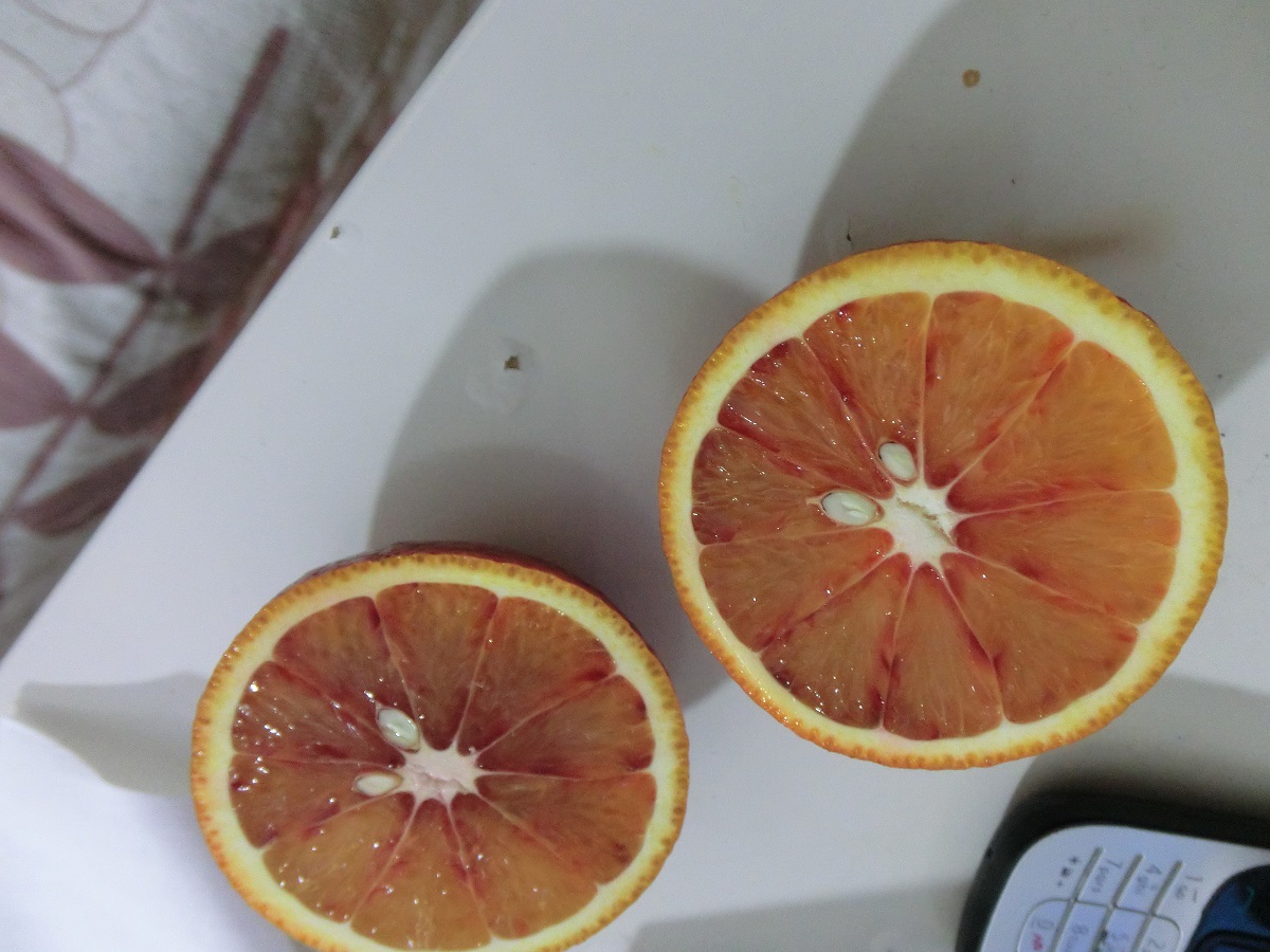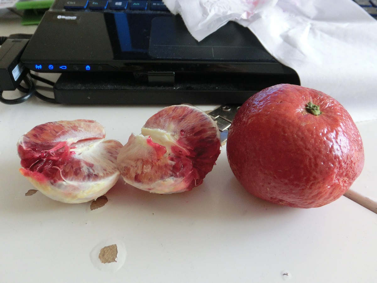 皮を剥くと硬い皮とは裏腹に果肉を包む薄皮は柔く、真っ赤な果汁がにじみ出る。なんと中まで赤かった。香川県には小原紅早生という赤いみかんがあるようだが、色の濃さではこちらの勝ちだろう。