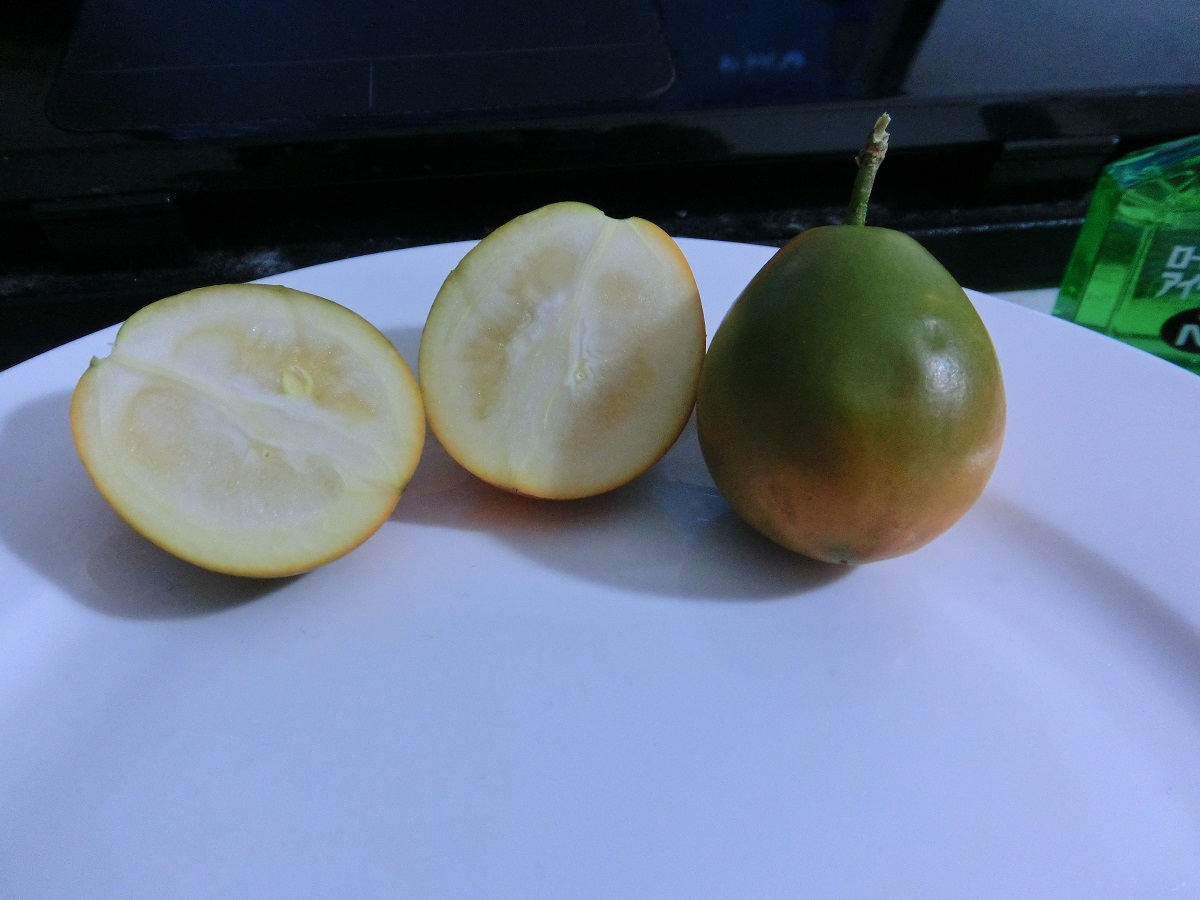 直径4センチ程度の果物には柑橘系の皮にあるような斑点状の模様がなかった。皮は指で剥ける硬さなのだがその感触は洋なしに似ている。表皮を向くと白い皮が見えるが、みかんの白い筋と同じように剥くことはできず、爪で削るかナイフで削ぎ取るしかなかった。
