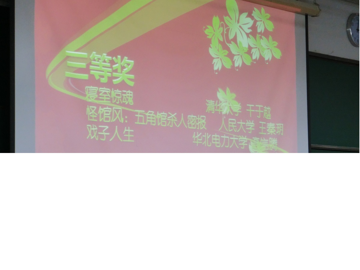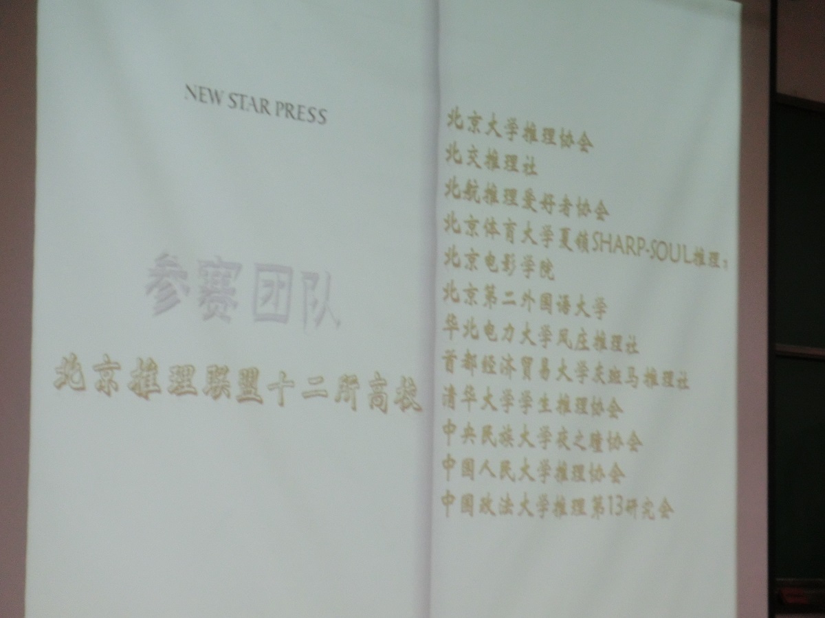 『北京高校推理聯盟 第1回ミステリー作品募集大会』では北京の各大学合計12のミス研が参加し、12の作品がエントリーされました。当日に全ての作品を読む時間などは当然無かったため、執筆者による作品のあらすじと特徴の紹介に留まりましたが、中国色を強く出した作品や、同人誌的なパロディ、実験的な内容、有名作品のオマージュなど、聞く限りでは面白そうでした。