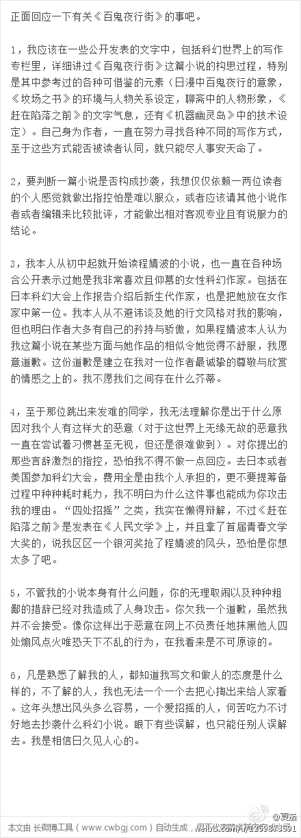 11月26日、夏笳は突然何の脈絡もなく自身の作品『《百鬼夜行街》に関することについて正面から返答する』という長文ツイートを発表します。