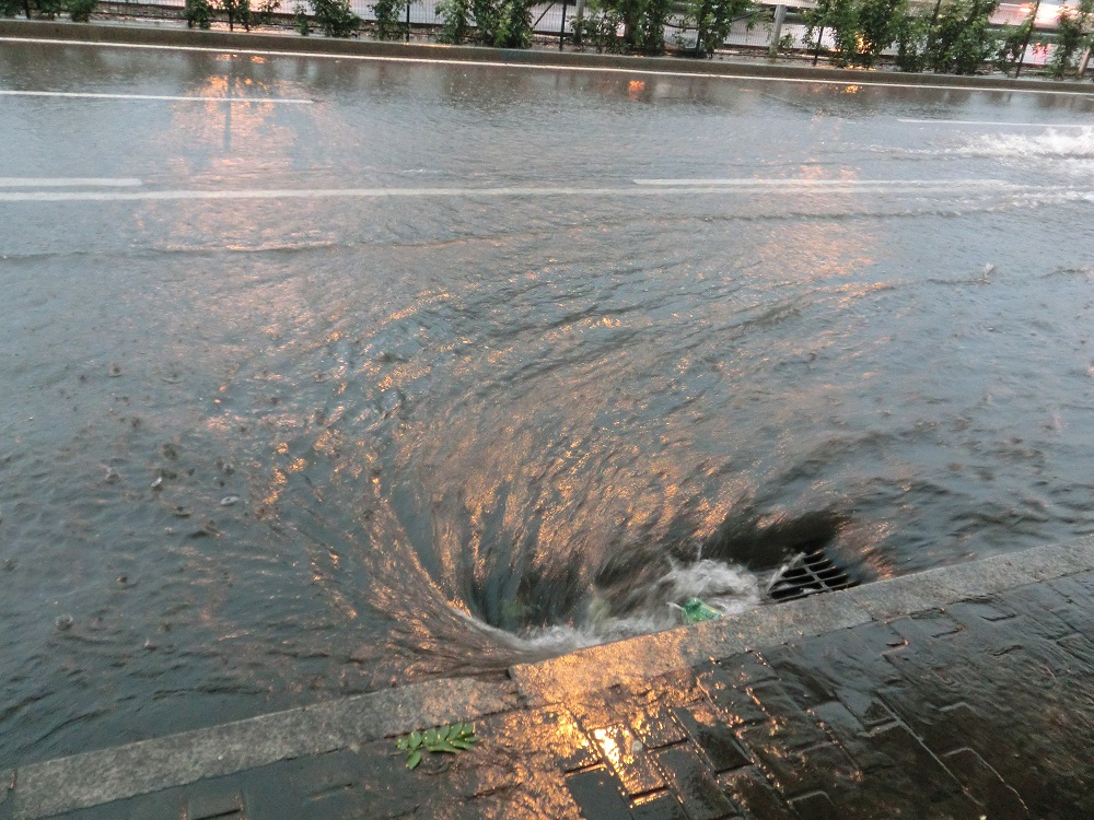 排水しきれなくなった雨水が歩道にまで浸水している。