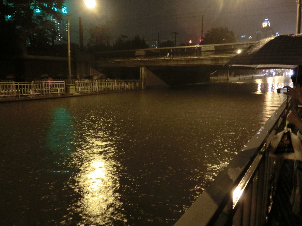 上に線路を敷きトンネルを潜るような造りのこの車道は位置が低い。そこに水が溜まるのは必然だが、いくら排水構造が悪くてもここまで溢れかえるだろうか。幸い歩道は歩けなくはなかったのでふくらはぎまで濡らして渡ることができたが、おかげで靴が完全におしゃかになった。大雨が降ると靴を足ごとビニール袋で包んで歩く中国人が多く、今日も実際に見かけたが、この水量だとそれも無駄な足掻きだっただろう。